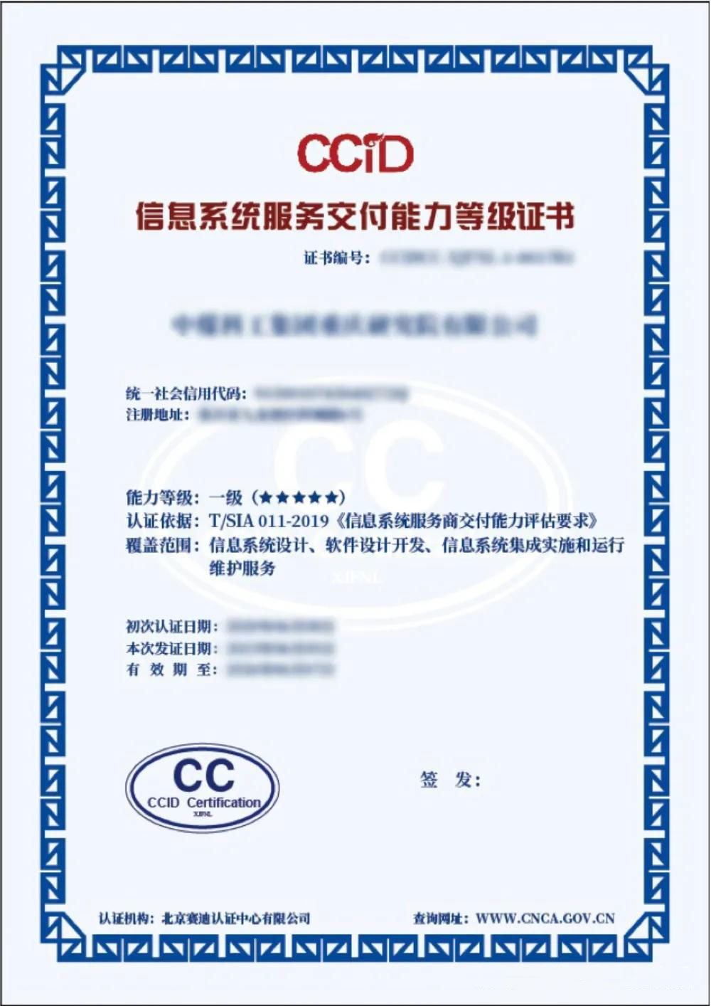 信息系統服務交付能力等級認證是由北京賽迪認證中心有限公司開展的自愿性服務認證,該認證已獲得中國國家認證認可監督管理委員會備案。認證依據為 T/SIA 011-2024《信息系統服務商交付能力評估要求》,對信息系統服務商的交付能力進行評估認證,簡稱為 CCID。