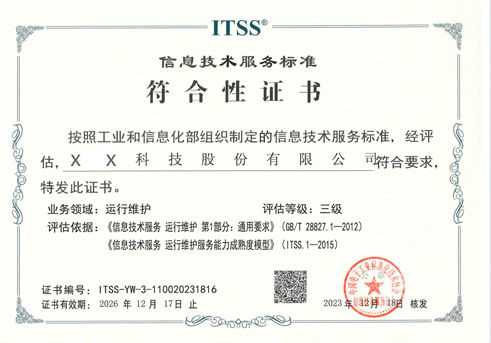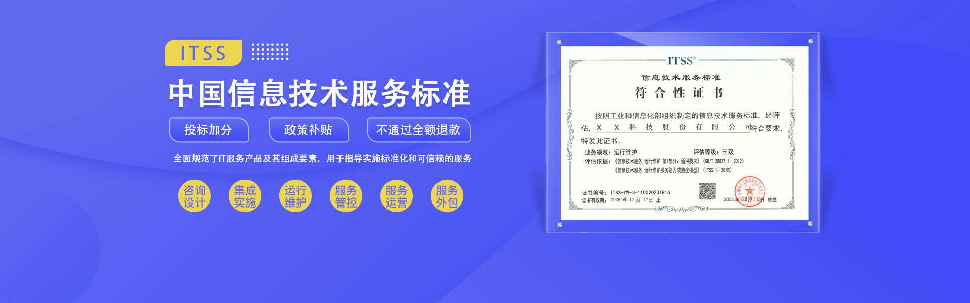 ITSS資質認證指信息技術服務標準成熟度符合性評估,目前市面上的ITSS認證主要以ITSS信息技術服務運行維護資質為主。