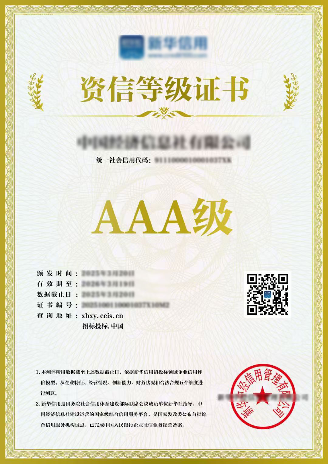 企業信用等級AAA證書屬于一種榮譽資質,是提升企業公信力和影響力保障的一項資質。信用等級是信用 (資信)評估機構根據企業資信結果對企業信用度進行的評價,它反映了企業信用度的高低。