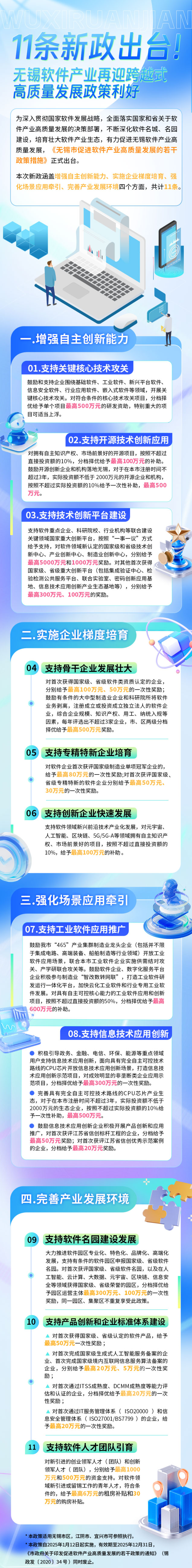 基于2020年無錫出臺的一版《促進軟件產業高質量發展的若干政策》再“提級”,此次發布的政策舉措延續人才引育、載體建設、強鏈補鏈、示范打造等基礎舉措外,研判行業趨勢、鍛造特色“長板”,形成了包括增強自主創新能力、實施企業梯度培育、強化場景應用牽引、完善產業發展環境四個部分、共11條的支持體系。
